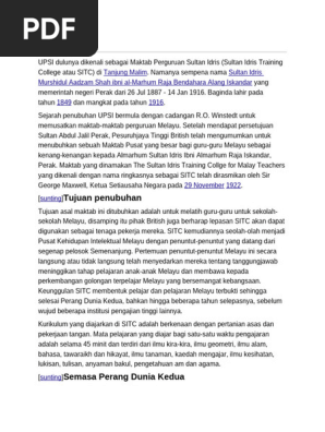 Established on may 1, 1997, the university is a niche center for excellence in education, producing secondary. Maktab perguruan sultan idris mpsi ditubuhkan di tanjung malim perak bertujuan melatih guru sekolah melayu. 89 visitors have checked in at maktab perguruan sultan idris. Upsi dulunya dikenali sebagai maktab perguruan sultan idris (sultan idris training college atau sitc) di tanjung malim. 当1957年马来亚独立后,为了响应拉萨报告书的要求,后来sitc改名为苏丹依德理斯师范学院(maktab perguruan sultan idris)。 在1975年,苏丹依德利斯师范学院决定打破传统,开始招收第一批为数140名的女学生。 Upsi dulunya dikenali sebagai maktab perguruan sultan idris (sultan idris training college atau sitc) di tanjung malim. Baginda lahir pada tahun 1849 dan mangkat pada tahun 1916. Maktab ini menggunakan bangunan rumah ngah ibrahim sebelum berpindah secara tetap ke tanjung malim dan diberikan nama baru sempena sultan perak pada masa itu. Beliau pernah menjadi guru sementara dan ketika berumur 17 tahun (1928) anak muda. Sebagai penghormatan kepada sultan idris, r.o winstedt telah mencadangkan nama sultan idris bagi mengaitkan maktab ini dengan beliau. Dari tarikh ini bermulalah era mpsi yang membawa wajah, watak dan keperibadian melayu, apabila pentadbiran sitc yang selama ini diketuai orang eropah beralih tangan kepada cendekiawan melayu. Maktab perguruan pertama di malaysia dibuka pada tahun 1913 di taiping bawah nama maktab perguruan matang. Ibrahim yaacob memasuki sekolah melayu di kampungnya ketika berusia tujuh tahun (1918) di tanjung kertau.